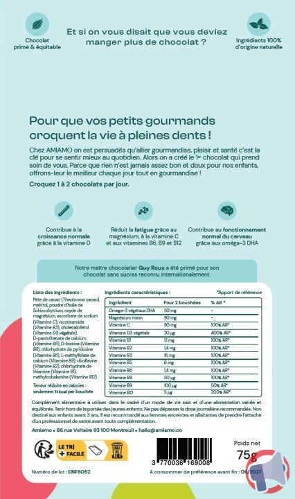 En raison d'un problème de teneur en vitamine d non conforme à l’étiquetage, pouvant entraîner un dépassement des apports recommandés chez les enfants., le produit chocolat en pastilles - enfants de la marque Amiamo et distribué par Amiamo en France entière a fait l'objet d'un rappel le 22 déc. 2025. Il est fortement recommandé de contacter le service consommateur et ne plus consommer ce produit si vous avez acheté une ou plusieurs des références suivantes : lot : ddm 09/2026.