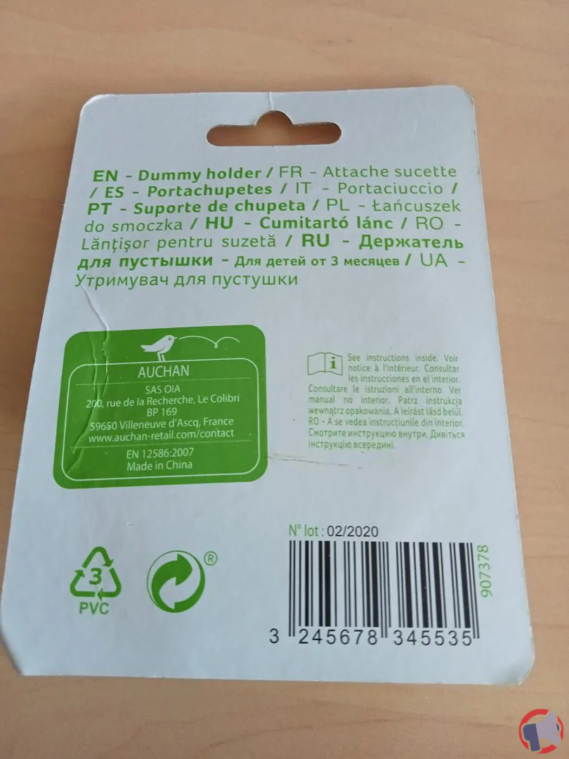 Suite à un problème de nous ne pouvons exclure le risque de casse de la chaînette suite à impact pouvant ainsi libérer des petits éléments susceptibles d’être ingérés., le produit attache sucette de la marque Auchan Essentiel et distribué dans les enseignes AUCHAN et les MAGASINS physiques et/ou digitaux qui distribuent le(s) produit(s) à la marque AUCHAN en France entière a fait l'objet d'un rappel le 10 août 2022. Il est fortement recommandé de ne plus utiliser le produit et rapporter le produit au point de vente ce produit si vous avez acheté une ou plusieurs des références suivantes : attache sucette ean 3245678345535 - aie 907378.