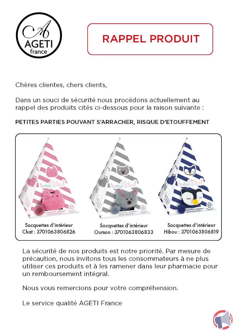 En raison d'un problème de petites parties pouvant s'arracher, risque d'étouffement, le produit socquettes babyoop's de la marque Babyoop's et distribué par Pharmacies en France entière a fait l'objet d'un rappel le 19 mai 2022. Il est fortement recommandé de ne plus utiliser le produit et rapporter le produit au point de vente ce produit si vous avez acheté une ou plusieurs des références suivantes : socquettes d'intérieur chat, socquettes d'intérieur hibou et socquettes d'intérieur ourson.