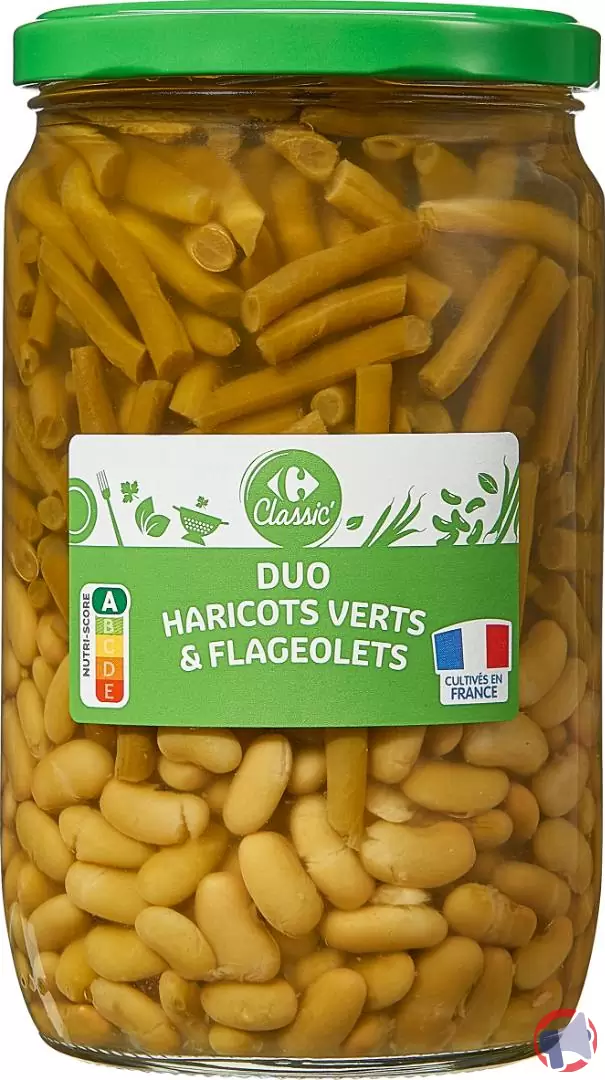 Suite à un problème de risque de présence de corps étrangers, le produit duo haricots verts & flageolets de la marque CARREFOUR Classic et distribué dans les enseignes CARREFOUR en France entière a fait l'objet d'un rappel le 9 déc. 2021. Il est fortement recommandé de contacter le service consommateur, détruire le produit, ne plus consommer et rapporter le produit au point de vente ce produit si vous avez acheté une ou plusieurs des références suivantes : duo haricots verts & flageolets - bocal 720ml.
