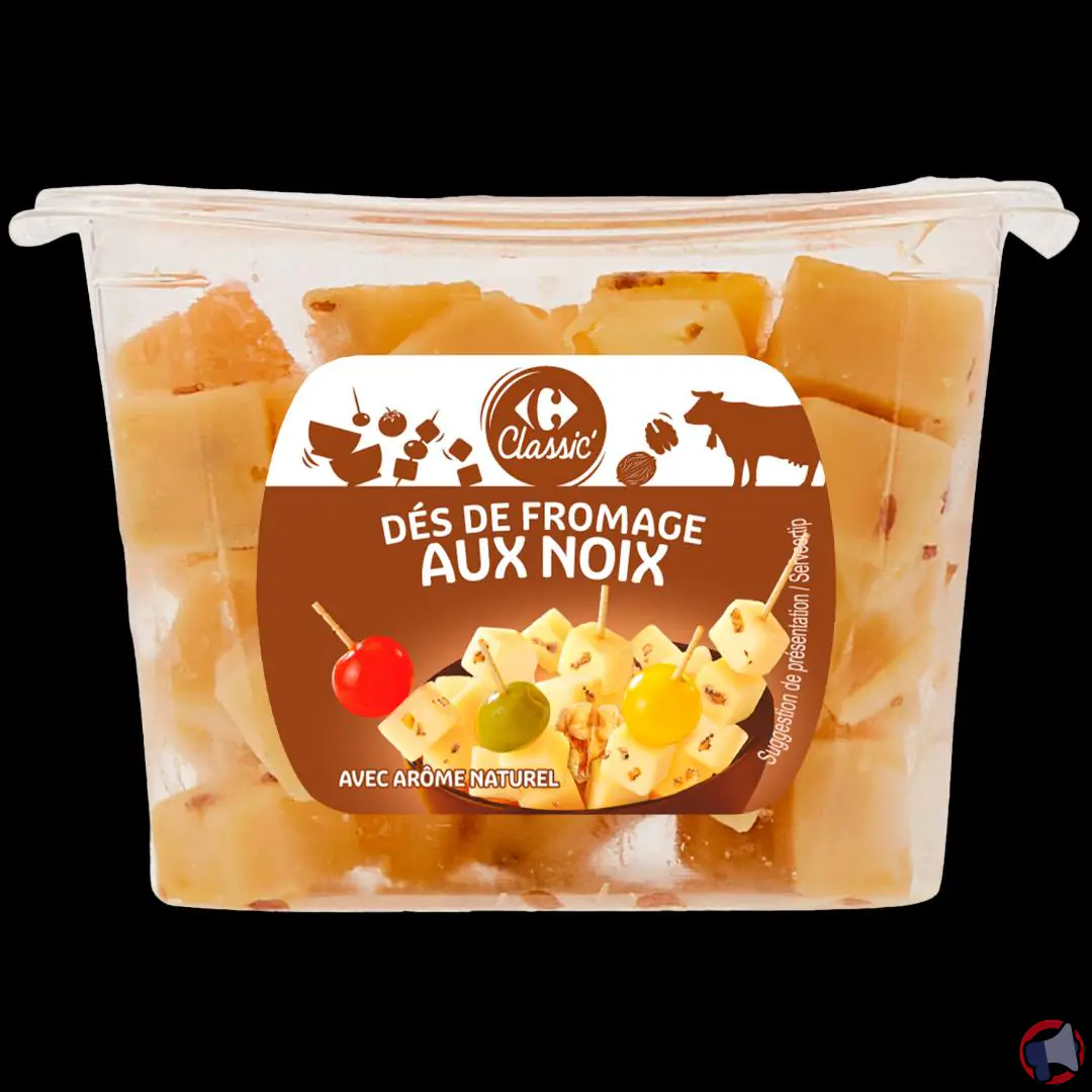 En raison d'un problème de détection de listéria monocytogènes <10 ufcg, le produit dés de fromage au noix 150g carrefour classic de la marque Carrefour Classic et distribué par Carrefour et supermarchés Match en France entière a fait l'objet d'un rappel le 3 avr. 2026. Il est fortement recommandé de contacter le service consommateur, détruire le produit, ne plus consommer et rapporter le produit au point de vente ce produit si vous avez acheté une ou plusieurs des références suivantes : dés de fromage au noix 150g carrefour classic.