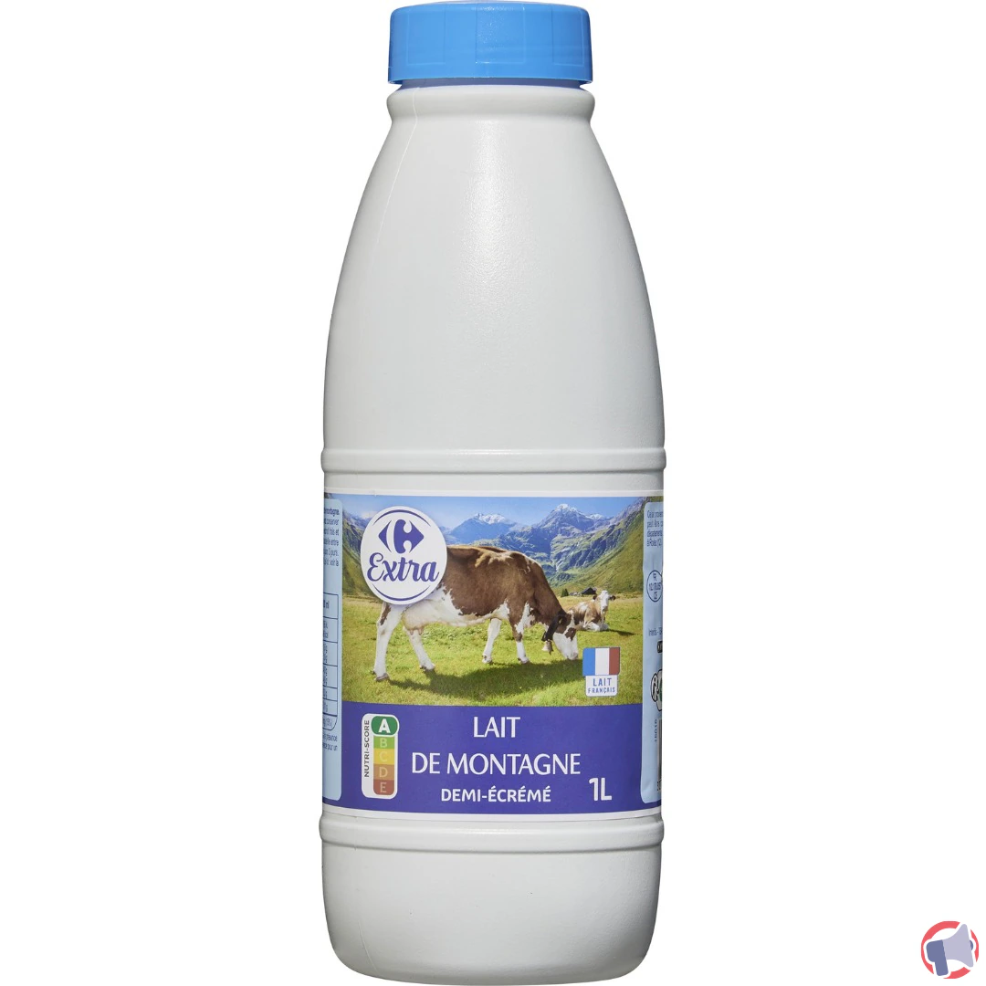 En raison d'un problème de produit déphasé, ressemble à du lait caillé, le produit lait de montagne demi ecreme de la marque CARREFOUR EXTRA et distribué par Enseignes de Carrefour en France entière a fait l'objet d'un rappel le 20 août 2025. Il est fortement recommandé de contacter le point de vente, contacter le service consommateur, détruire le produit, ne plus consommer, ne plus utiliser le produit et rapporter le produit au point de vente ce produit si vous avez acheté une ou plusieurs des références suivantes : lait de montagne demi ecreme bouteille de 1l ean 3270190204374 / pack de 6x1l ean 3270190430049.