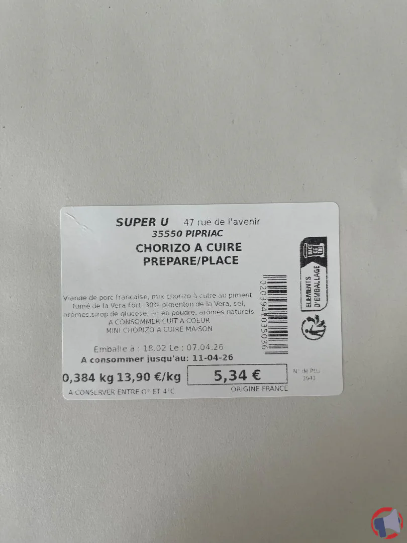 En raison d'un problème de présence de salmonelles, le produit chorizo à cuire préparé sur place et distribué par Super U Pipriac en Vente uniquement au magasin a fait l'objet d'un rappel le 9 avr. 2026. Il est fortement recommandé de détruire le produit, ne plus consommer et rapporter le produit au point de vente ce produit si vous avez acheté une ou plusieurs des références suivantes : chorizo a cuire prepare sur place vendu au rayon boucherie.