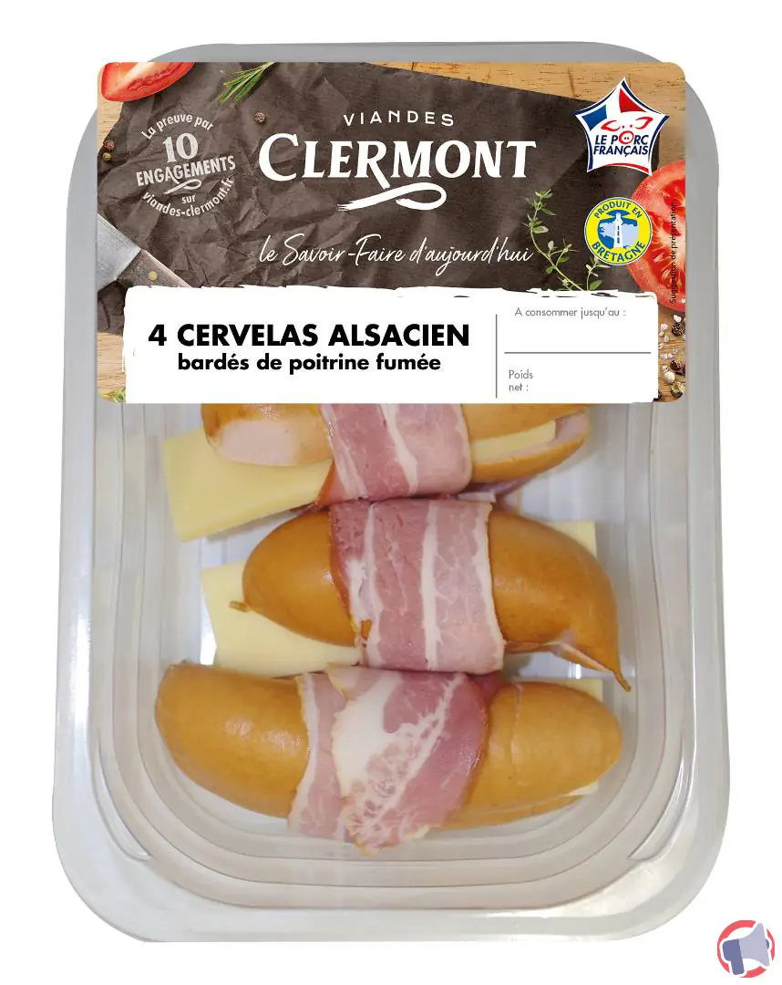 Suite à un problème de anomalie d'étiquetage : mention allergènes erronée, le produit 4 cervelas alsacien de la marque CLERMONT et distribué dans les enseignes LECLERC, CARREFOUR MARKET, INTERMARCHE, SYSTEME U en France entière a fait l'objet d'un rappel le 1 oct. 2025. Il est fortement recommandé de ne plus consommer et rapporter le produit au point de vente ce produit si vous avez acheté une ou plusieurs des références suivantes : 4 cervelas alsaciens bardés de poitrine fumée.