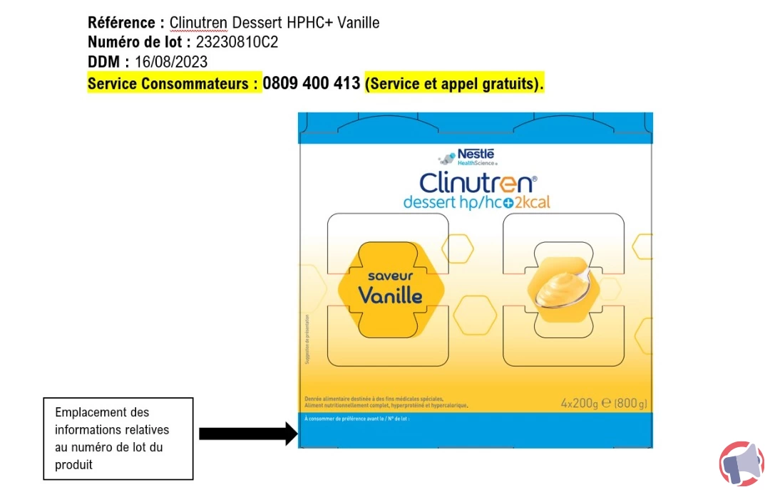 En raison d'un problème de rappel par mesure de précaution de l'ensemble du lot de fabrication suite à une erreur de distribution d'une palette non conforme ( heure de production entre 10h52 et 11h17), le produit dessert hphc+ 2kcal vanille 200g de la marque CLINUTREN et distribué par Pharmacies d'officine, grossistes répartiteurs, Prestataires de services et distributeurs de matériel en France entière a fait l'objet d'un rappel le 31 déc. 2022. Il est fortement recommandé de ne plus consommer et rapporter le produit au point de vente ce produit si vous avez acheté une ou plusieurs des références suivantes : clinutren dessert hphc+ 2kcal vanille 4x200g.