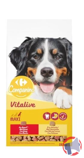 En raison d'un problème de detection de salmonelles dans un lot de matière première entrant dans la composition de plusieurs recettes de produits finis, le produit gamme croquettes chiens companino vitalive de la marque COMPANINO VITALIVE et distribué par carrefour en France entière a fait l'objet d'un rappel le 24 déc. 2024. Il est fortement recommandé de contacter le service consommateur, détruire le produit, ne plus consommer et rapporter le produit au point de vente ce produit si vous avez acheté une ou plusieurs des références suivantes : croquettes moelleuses poulet sachet 4 kg, croquettes boeuf légumes sachet 10kg, croquettes chiens maxi sachet 18kg, croquettes moelleuse bœuf sachet 4kg et croquettes senior chien sachet 4kg.