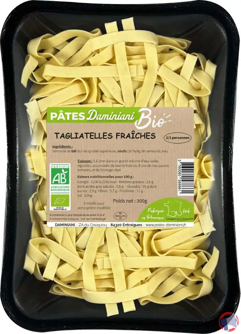 En raison d'un problème de présence de listeria monocytogenes, le produit tagliatelles fraiches aux oeufs bio de la marque Daminiani et distribué par Intermarché, Leclerc, Carrefour, Système U en Régions : Occitanie, Provence-Alpes-Côte d'azur a fait l'objet d'un rappel le 22 mai 2025. Il est fortement recommandé de ne plus consommer ce produit si vous avez acheté une ou plusieurs des références suivantes : tagliatelles fraiches aux oeufs bio.