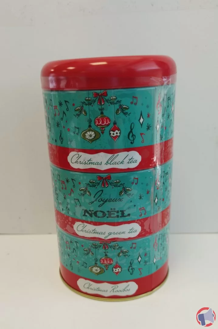 - 3 boites de thé de Noël empilées : 1 thé vert, 1 thé rooibos, 1 thé noir