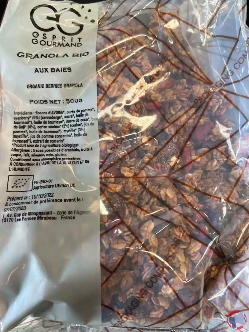 Suite à un problème de détection de sulfites, le produit granola aux baies bio de la marque Eprit gourmand et distribué dans les enseignes Hôtellerie en France entière a fait l'objet d'un rappel le 28 déc. 2022. Il est fortement recommandé de contacter le point de vente, contacter le service consommateur, détruire le produit, ne plus consommer et ne plus utiliser le produit ce produit si vous avez acheté une ou plusieurs des références suivantes : granola aux baies bio en sachets de 50 g, 500 g..