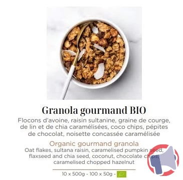 - Granola gourmand bio en Sachets de 50 g et 500 g.