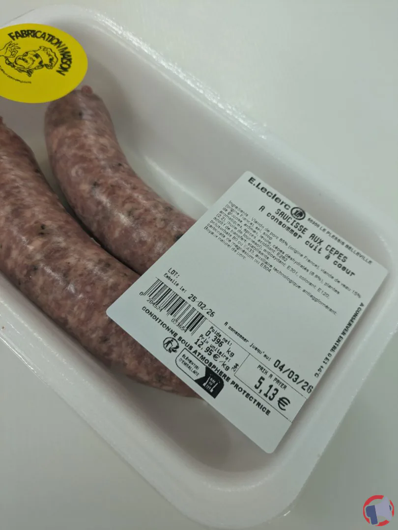 En raison d'un problème de mise en évidence de la présence de la bactérie listeria monocytogenes, le produit saucisse aux cèpes de la marque Fabrication interne et distribué par Hypermarché E. LECLERC du Plessis-Belleville en Hypermarché E. LECLERC du Plessis-Belleville a fait l'objet d'un rappel le 27 févr. 2026. Il est fortement recommandé de détruire le produit et ne plus consommer ce produit si vous avez acheté une ou plusieurs des références suivantes : ras.