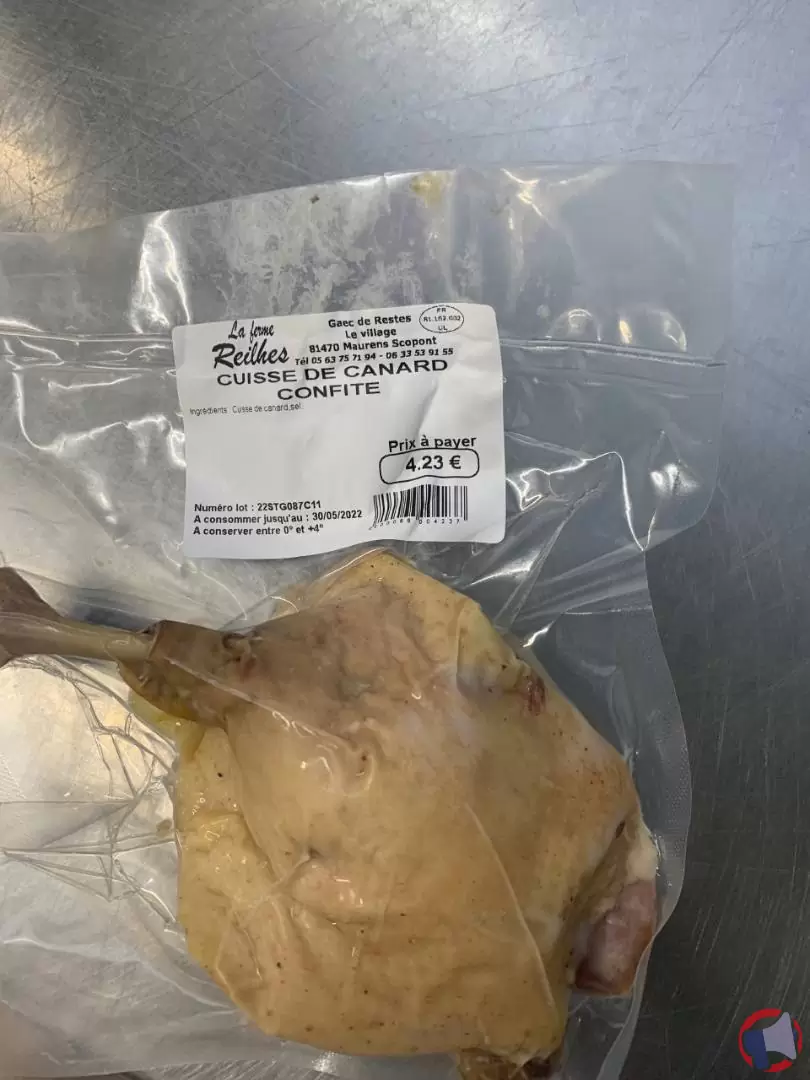 En raison d'un problème de présence de listéria monocytogène, le produit cuisse de canard confite de la marque La Ferme Reilhes et distribué par Marché de Lavaur ( 81 ) le mercredi matin et le samedi matin Marché de Blagnac ( 31 ) le mercredi après midi et le samedi matin en France entière a fait l'objet d'un rappel le 22 avr. 2022. Il est fortement recommandé de contacter le point de vente, détruire le produit, ne plus consommer, ne plus utiliser le produit et rapporter le produit au point de vente ce produit si vous avez acheté une ou plusieurs des références suivantes : cuisse de canard confite.