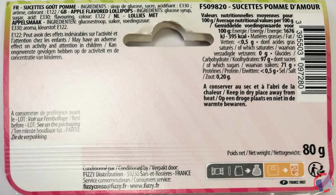 En raison d'un problème de presence d'un colorant (e122) en teneur superieure a la limite maximale reglementaire., le produit fizzy sweet sucettes pomme d'amour de la marque FIZZY et distribué par AUCHAN, CARREFOUR, CHAMPION, E. LECLERC, CORA, INTERMARCHE, SYSTEME U en France entière a fait l'objet d'un rappel le 25 févr. 2022. Il est fortement recommandé de ne plus consommer et rapporter le produit au point de vente ce produit si vous avez acheté une ou plusieurs des références suivantes : fs09820 – fizzy sweet sucettes pomme d’amour.
