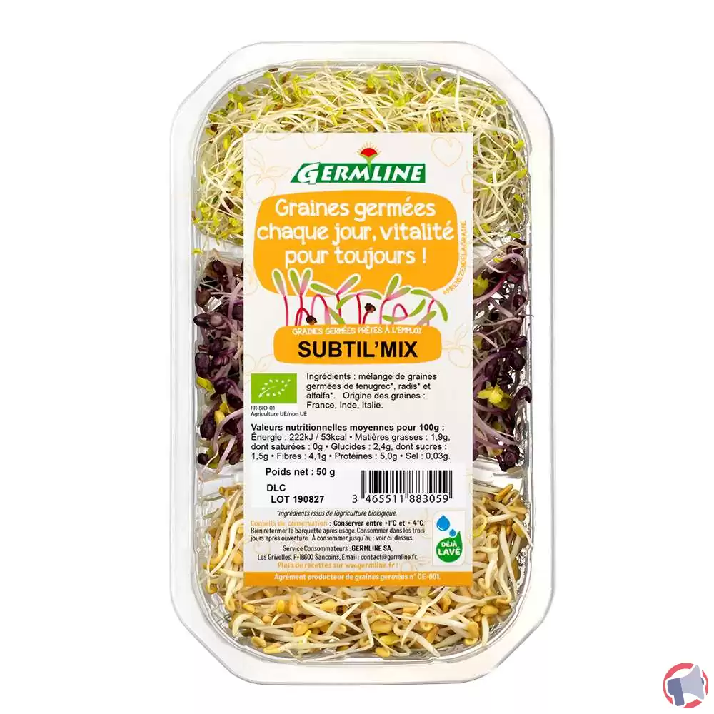 En raison d'un problème de détection de salmonelle, le produit graines germées biologiques subtil'mix 50g de la marque GERMLINE et distribué par Biocoop Les nouveaux Robinson Relais vert en France entière a fait l'objet d'un rappel le 5 mai 2022. Il est fortement recommandé de détruire le produit, ne plus consommer, ne plus utiliser le produit et rapporter le produit au point de vente ce produit si vous avez acheté une ou plusieurs des références suivantes : graines germées biologiques subtil'mix 50g.
