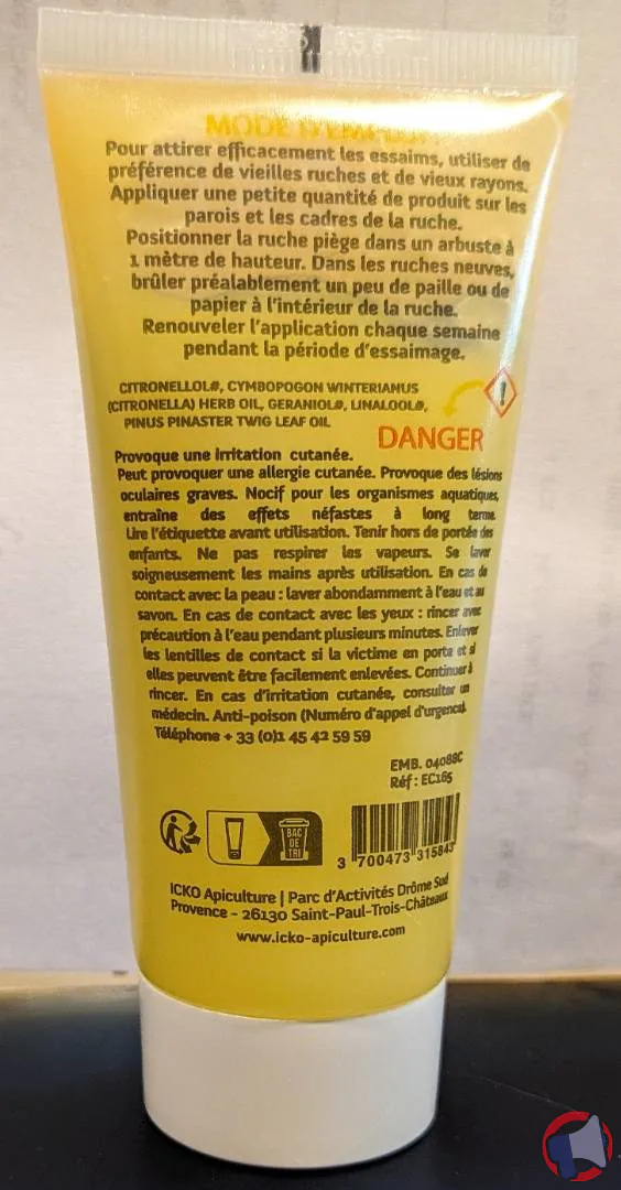 En raison d'un problème de emballage et étiquetage non conformes minimisant les risques inhérents à l'utilisation du produit., le produit attire essaim - parfum aristée - tube de 50g de la marque ICKO APICULTURE et distribué par L'ensemble des magasins Icko Apiculture + site internet : www.icko-apiculture.com L'ensemble des revendeurs partenaires d'Icko apiculture en France entière a fait l'objet d'un rappel le 12 mars 2025. Il est fortement recommandé de ne plus utiliser le produit et rapporter le produit au point de vente ce produit si vous avez acheté une ou plusieurs des références suivantes : ec165- attire essaim - parfum aristée- tube de 50g.