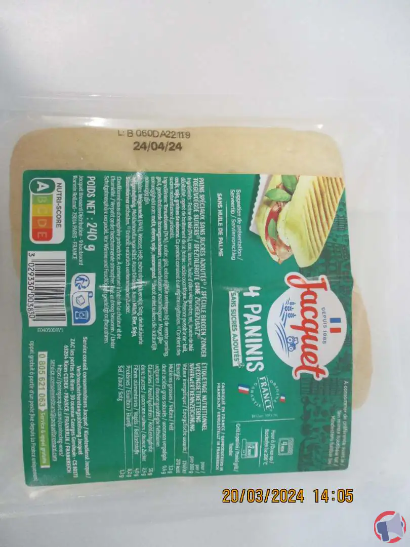 Suite à un problème de risque de présence de corps étrangers métalliques, le produit 4 paninis sans sucre ajoutes jacquet 240g de la marque JACQUET et distribué dans les enseignes CASINO / AUCHAN / CARREFOUR / LECLERC / HPRO / INTERMARCHE / KHADISPAL / MATCH / CORA en France entière a fait l'objet d'un rappel le 21 mars 2024. Il est fortement recommandé de détruire le produit, ne plus consommer et rapporter le produit au point de vente ce produit si vous avez acheté une ou plusieurs des références suivantes : 4 paninis sans sucre ajoutes jacquet 240g.