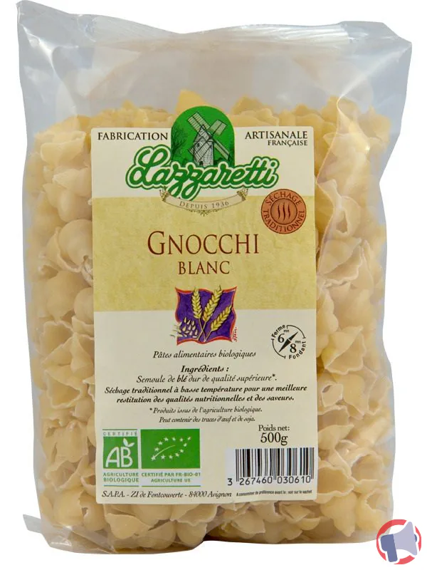 Suite à un problème de présence de traces de mollusques non étiquetées, le produit gnocchi blanc bio 500gr de la marque LAZZZARETTI et distribué dans les enseignes EPICE SCOP en France entière a fait l'objet d'un rappel le 11 sept. 2025. Il est fortement recommandé de détruire le produit et ne plus consommer ce produit si vous avez acheté une ou plusieurs des références suivantes : gnocchi blanc bio 500gr.