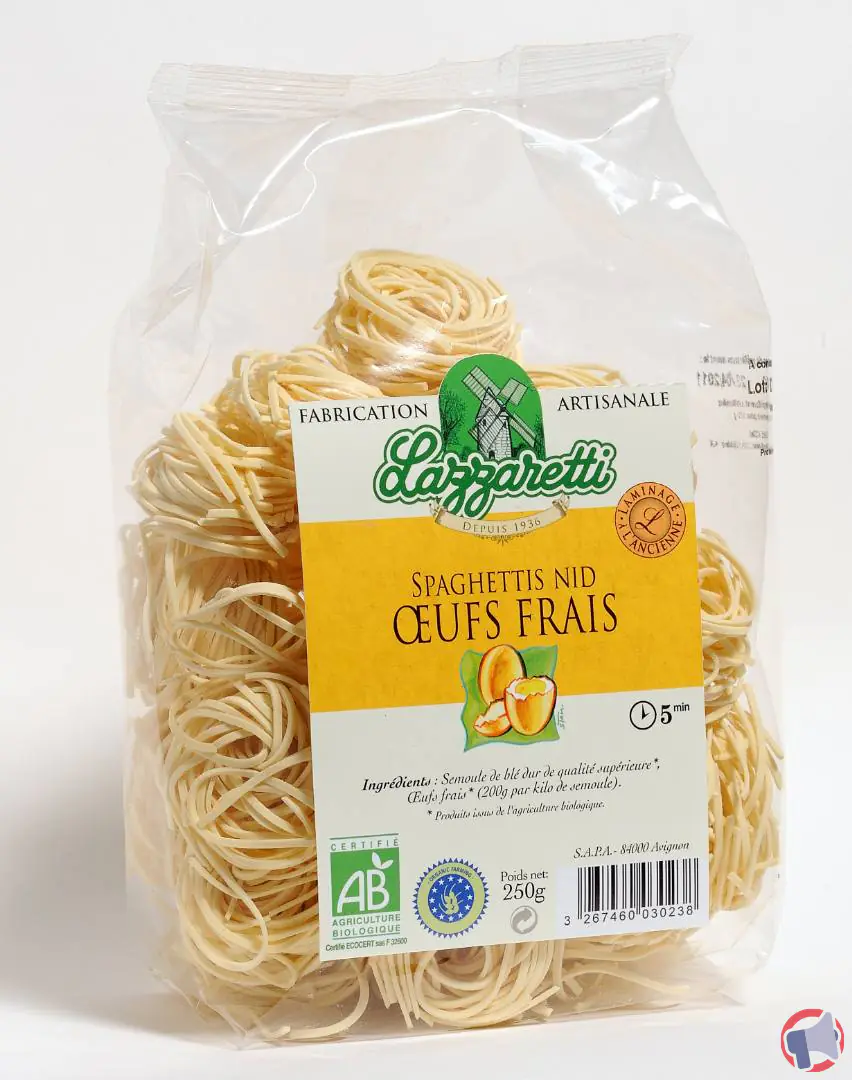 En raison d'un problème de présence de traces de mollusques non étiquetées, le produit spaghetti nids aux oeufs bio 250gr de la marque LAZZZARETTI et distribué par LA VIE CLAIRE en France entière a fait l'objet d'un rappel le 11 sept. 2025. Il est fortement recommandé de détruire le produit et ne plus consommer ce produit si vous avez acheté une ou plusieurs des références suivantes : spaghetti nids aux oeufs bio 250gr.