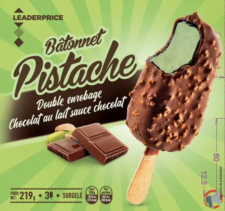 Ne pas consommer Bâtonnet Pistache double enrobage chocolat au lait sauce chocolat x3 219g – Leader Price Leader Price