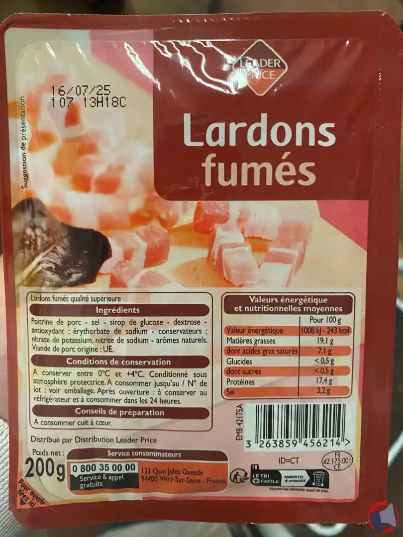 Ne plus consommer LARDONS FUMES QUALITE SUPERIEURE 200G - LEADER PRICE LEADER PRICE