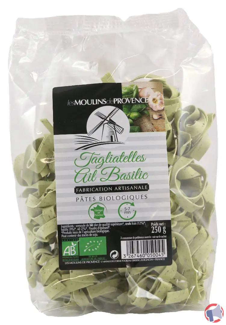 Suite à un problème de présence de traces de mollusque non étiquetées, le produit tagliatelle ail basilic aux oeufs bio 250gr de la marque MOULIN DE PROVENCE et distribué dans les enseignes DISTRIBIO MONOPRIX en France entière a fait l'objet d'un rappel le 16 sept. 2025. Il est fortement recommandé de détruire le produit et ne plus consommer ce produit si vous avez acheté une ou plusieurs des références suivantes : tagliatelle ail basilic aux oeufs bio 250gr.