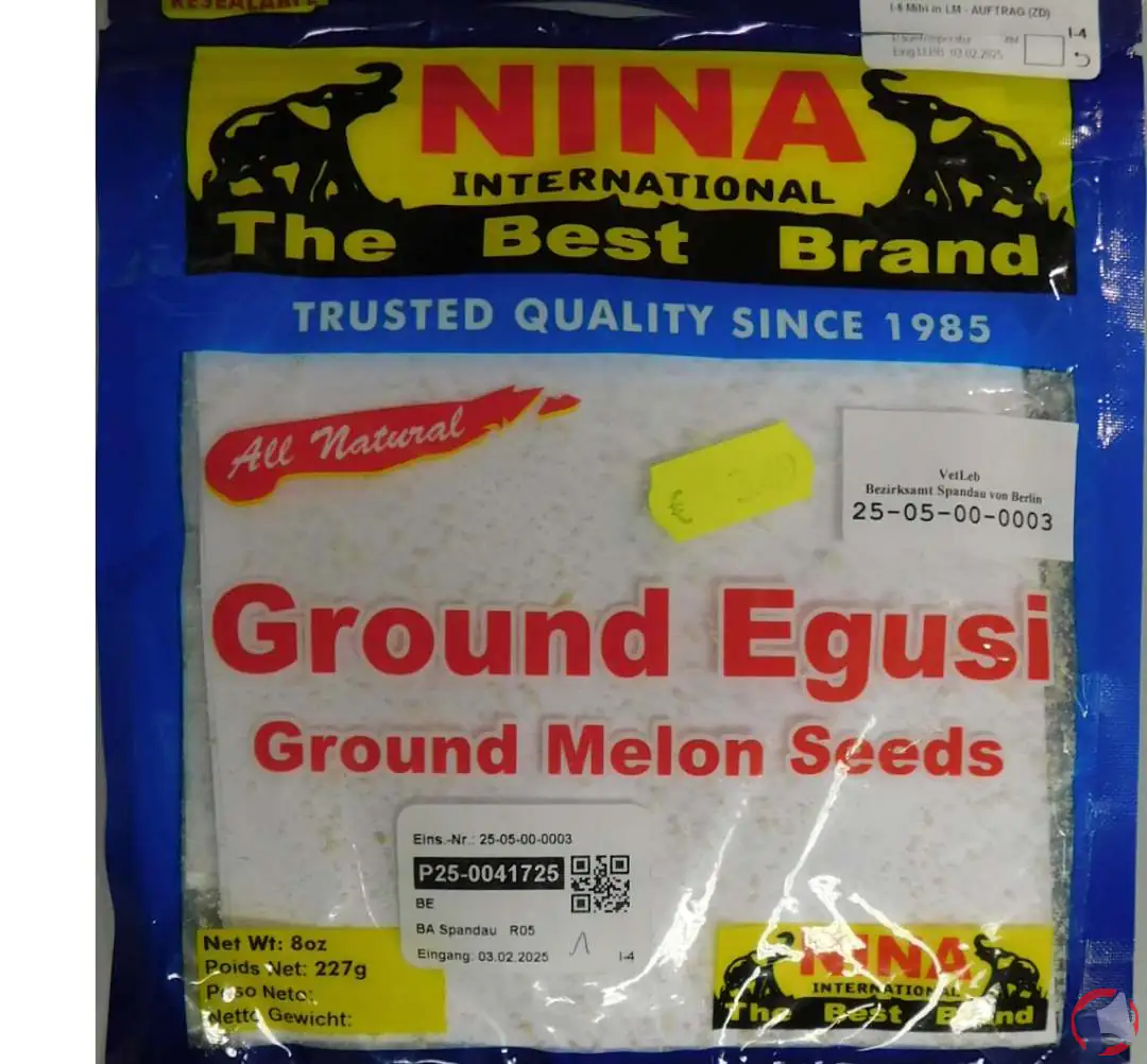 Suite à un problème de détection de salmonella spp. dans 25 g et de bacillus cereus présumé., le produit egusi moulu - graines de melon moulues de la marque NINA International et distribué dans les enseignes Vois pièce jointe. en Départements : CHARENTE-MARITIME (17), DROME (26), FINISTERE (29), HAUTE-GARONNE (31), MOSELLE (57), BAS-RHIN (67), HAUT-RHIN (68), RHONE (69), SEINE-ET-MARNE (77), VAUCLUSE (84) a fait l'objet d'un rappel le 25 févr. 2025. Il est fortement recommandé de détruire le produit, ne plus consommer et ne plus utiliser le produit ce produit si vous avez acheté une ou plusieurs des références suivantes : egusi ground - ground melon seeds.