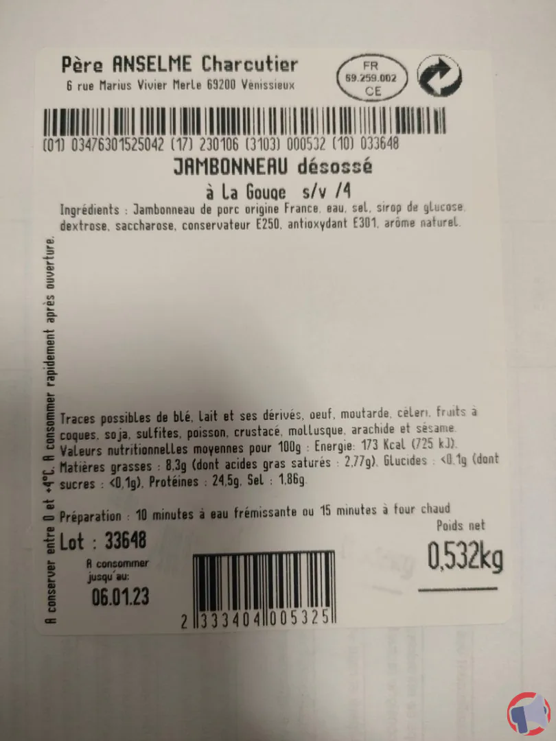 En raison d'un problème de listeria monocytogenes détectée, avec dénombrement <10 ufc/g, le produit jambonneau cuit de la marque Père Anselme et distribué par enseignes Leclerc, Carrefour + des bouchers détaillants et grossistes voir ci-joint liste des points de vente concernés en France entière a fait l'objet d'un rappel le 16 déc. 2022. Il est fortement recommandé de contacter le service consommateur, détruire le produit, ne plus consommer, ne plus utiliser le produit et rapporter le produit au point de vente ce produit si vous avez acheté une ou plusieurs des références suivantes : jambonneau désossé à la gouge s/v /4, et sous vide par 4 jambonneaux, poche destinée au rayon coupe.