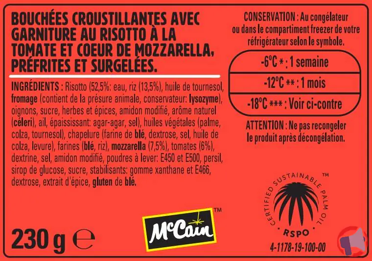 - Les consommateurs allergiques aux oeufs qui le souhaitent peuvent envoyer le code-barres original et le numéro de lot par courrier à : Service Consommateur, McCain Alimentaire SAS, Parc d’Entreprises Motte du Bois, 62440 Harnes.