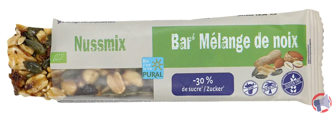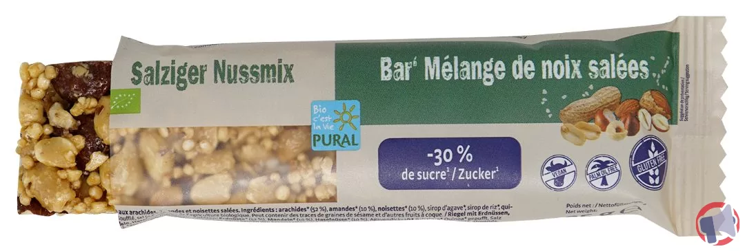 Suite à un problème de erreur d'emballage, le produit bar mélange de noix salées de la marque Pural et distribué dans les enseignes Magasins Bio en France entière a fait l'objet d'un rappel le 28 juil. 2021. Il est fortement recommandé de ne plus utiliser le produit et rapporter le produit au point de vente ce produit si vous avez acheté une ou plusieurs des références suivantes : bar mélange de noix salées 35 g.