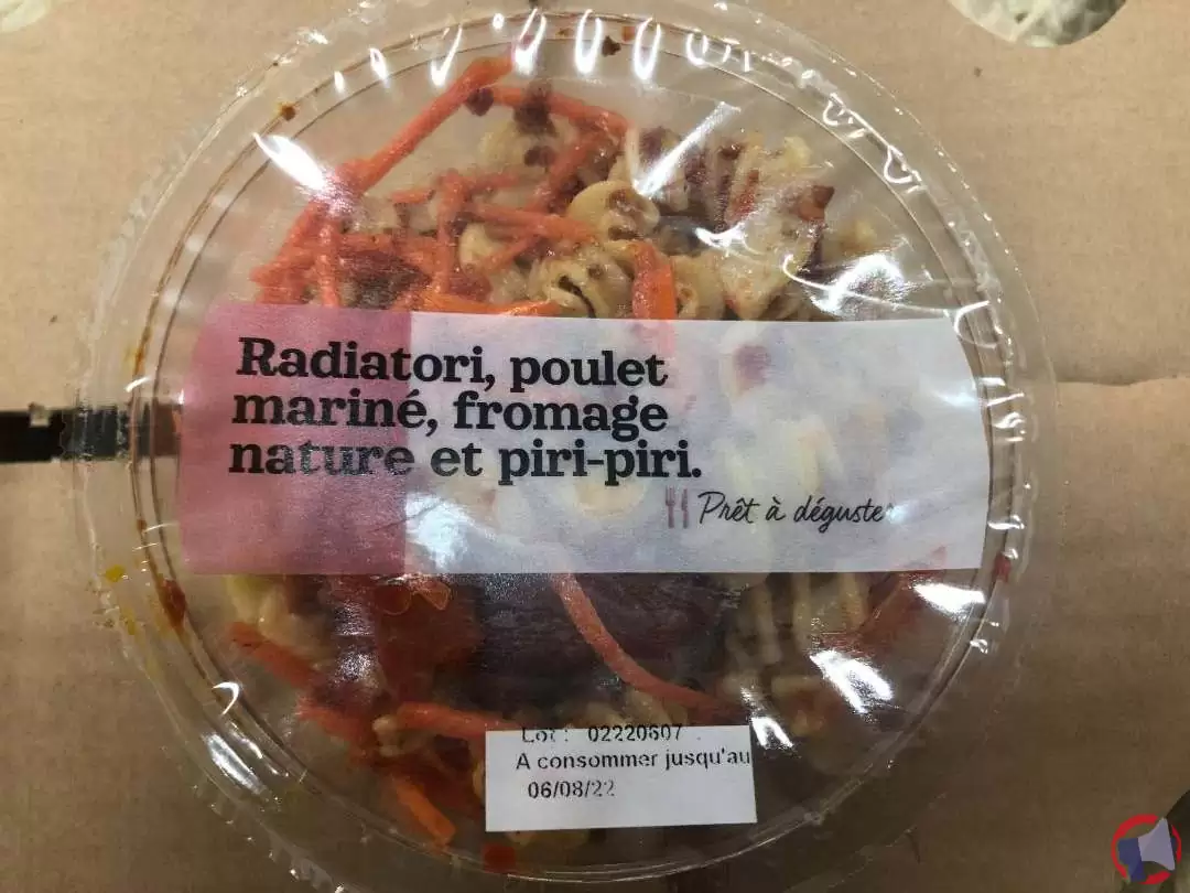 Suite à un problème de erreur étiquetage de la dlc, dlc 04/08/2022 au lieu 23/07/2022, le produit radiatori, poulet mariné, fromage nature et piri piri et distribué dans les enseignes Fresh en France entière a fait l'objet d'un rappel le 29 juil. 2022. Il est fortement recommandé de détruire le produit et ne plus consommer ce produit si vous avez acheté une ou plusieurs des références suivantes : radiatori, poulet mariné, fromage nature et piri piri.