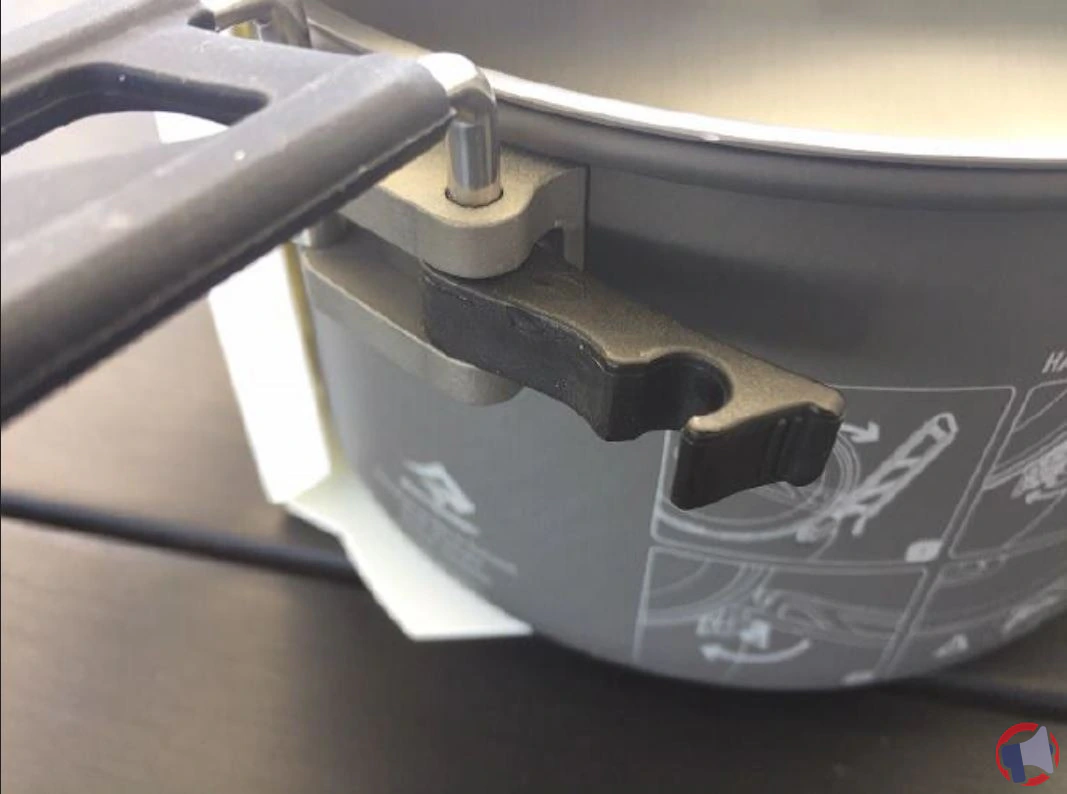 - La popote Alpha (version 2.0, voir photo) a un système de fixation avec un pivot et une patte de verrouillage en plastique nylon. La version 2.0 peut être identifiée par la patte noire, non fixée par une vis.