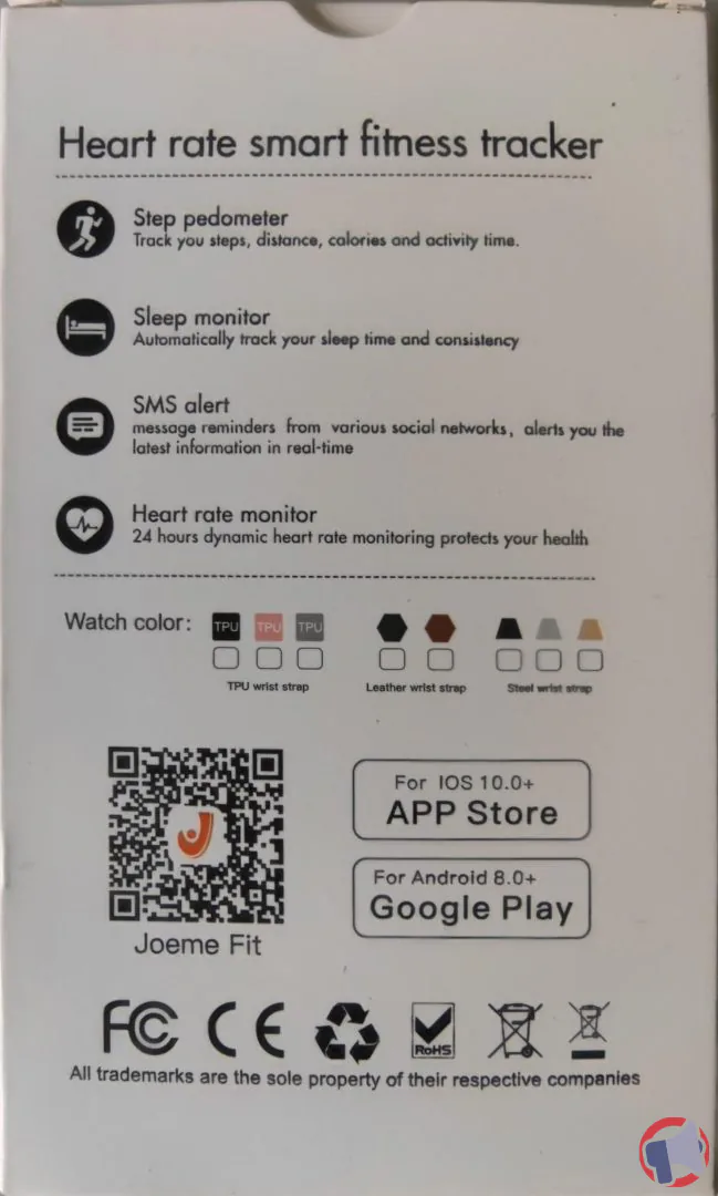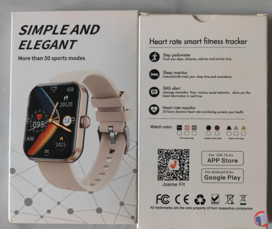 - Boîte en carton blanche avec visuels de la montre et description des fonctionnalités. Code QR au dos pour téléchargement de l’application. Bracelet en silicone, cuir ou métal selon le modèle.