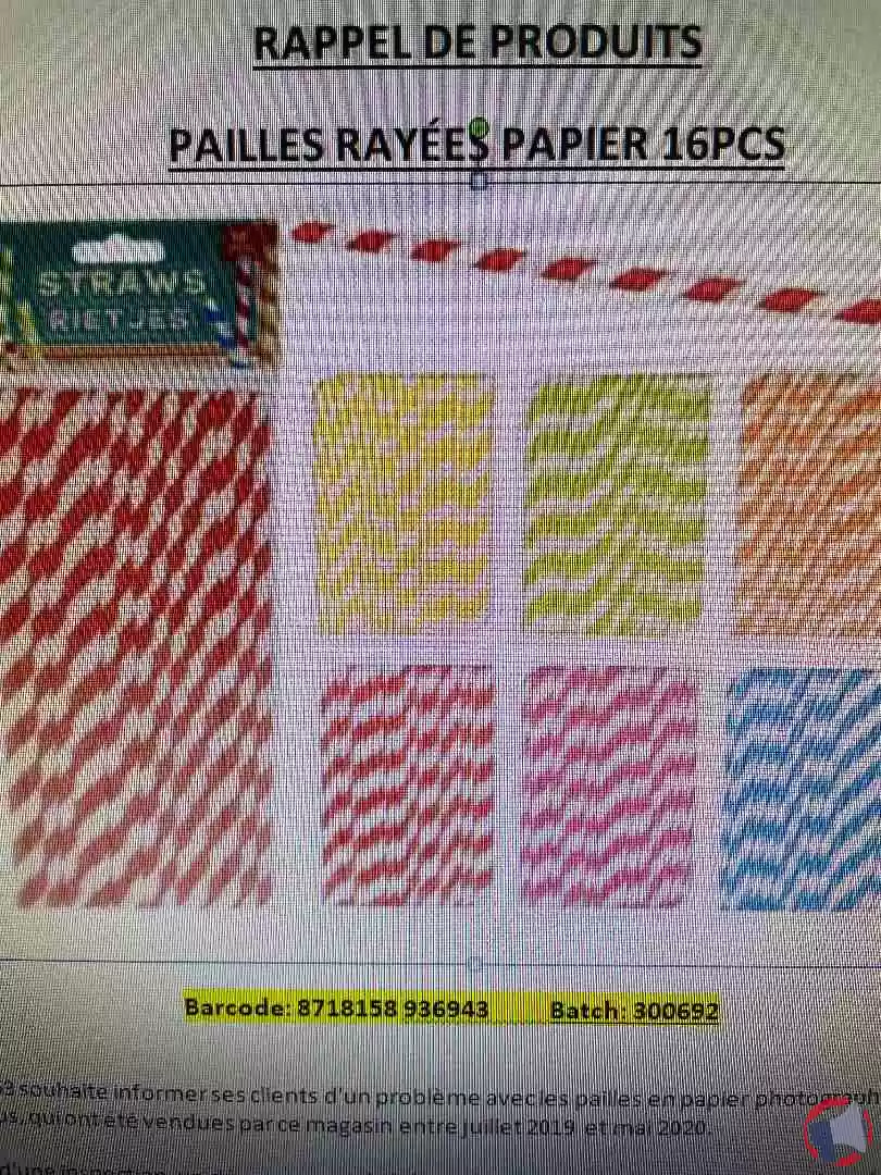 En raison d'un problème de dépassement de la limite légale en 3-mcpd, le produit pailles rayées papier 16pc de la marque straws rietjes et distribué par MARCHE AUX AFFAIRES CHARMES RAMBERVILLERS 88 en France entière a fait l'objet d'un rappel le 29 juil. 2022. Il est fortement recommandé de détruire le produit ce produit si vous avez acheté une ou plusieurs des références suivantes : straws rietjes.