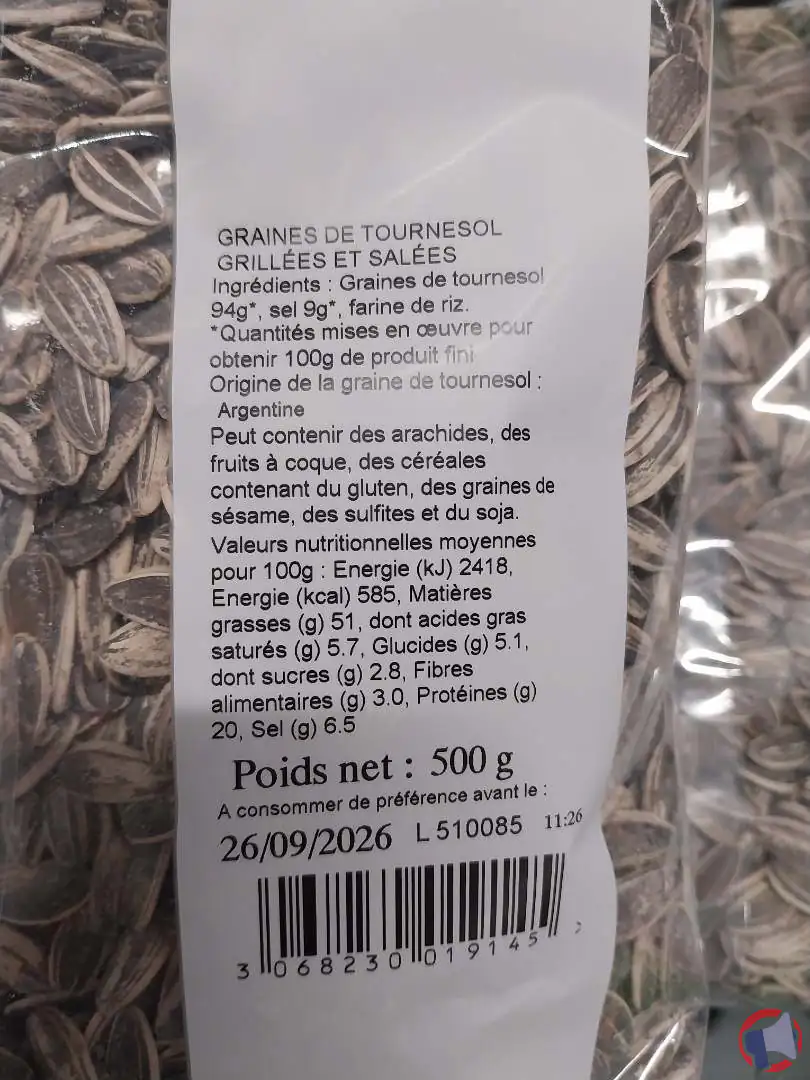 Ne plus consommer Graines de tournesol grillées salées SUNCHEFS