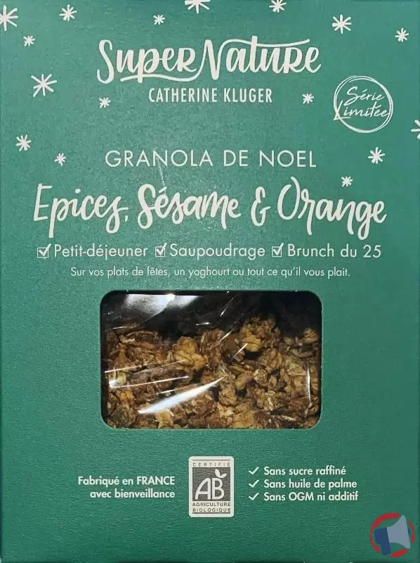 En raison d'un problème de présence d'oxyde d'éthylène à un niveau supérieur à la limite autorisée par la législation européenne dans l'un des ingrédients entrant dans la composition du produit., le produit granola epices de noël 350g de la marque SuperNature et distribué par Voir PDF en France entière a fait l'objet d'un rappel le 30 juin 2021. Il est fortement recommandé de ne plus consommer et rapporter le produit au point de vente ce produit si vous avez acheté une ou plusieurs des références suivantes : granola supernature epices de noël 350g.