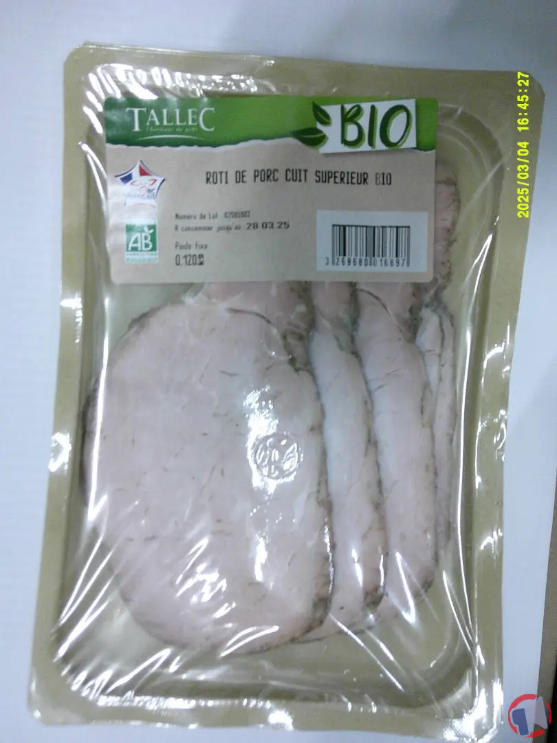 Suite à un problème de détection de listeria monocytogenes, le produit roti de porc cuit superieur saumure et bruni bio de la marque TALLEC et distribué dans les enseignes Système U et Cora en France entière a fait l'objet d'un rappel le 5 mars 2025. Il est fortement recommandé de détruire le produit, ne plus consommer et rapporter le produit au point de vente ce produit si vous avez acheté une ou plusieurs des références suivantes : roti de porc cuit superieur saumure et bruni bio barquette de 120g.