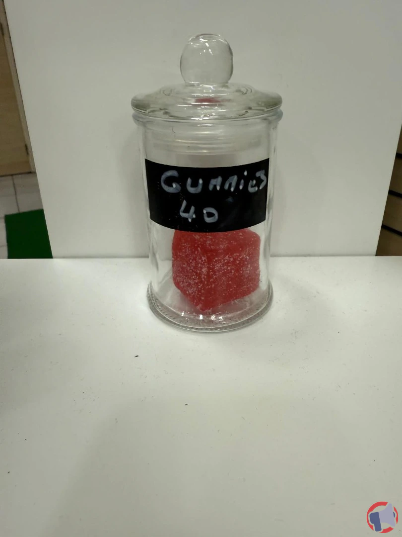- Gummies carrés de couleur rouge et gummies ronds de couleur jaune